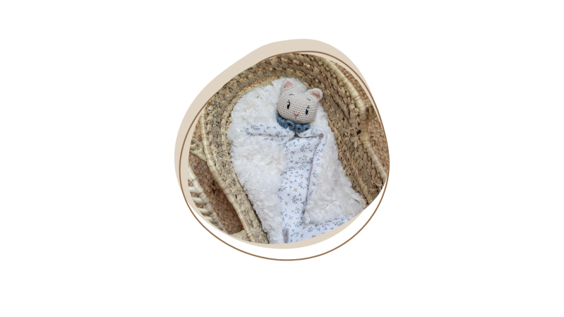Sacha, est un doudou chat entièrement fait à la main au crochet. Composé d'un tissu en gaze de coton et d'un tissu tout doux que vous avez la possibilité de choisir dans la rubrique des tissus. Avec ces grands yeux ouverts, vos petits bouts de choux vont en faire leur favoris. Vous pouvez le rendre encore plus unique en brodant le prénom de votre bébé.
