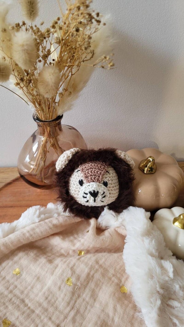 Gaspard, est un doudou Lion entièrement fait à la main au crochet. Composé d'un tissus en gaze de coton beige avec des petits coeurs dorés et d'un tissu blanc tout doux. Il deviendras le doudou favoris pour vos petits bouts de choux avec sont petit noeud pour y attacher la tétine ou pour que bébé le papouille.