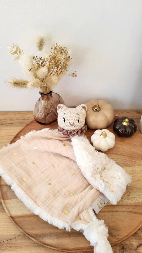 Sacha, est un doudou chat entièrement fait à la main au crochet. Composé d'un tissus en gaze de coton beige avec des petits coeurs dorés et d'un tissu blanc tout doux. Il deviendras le doudou favoris pour vos petits bouts de choux avec sont petit noeud pour y attacher la tétine ou pour que bébé le papouille.