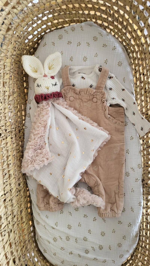 Possibilité de rajouté un petit nœud au bout du lange. Il permettra d'y attacher la tétine ou a bébé de le papouiller. - Personnalisation du prénom de bébé au fil (+6euros)