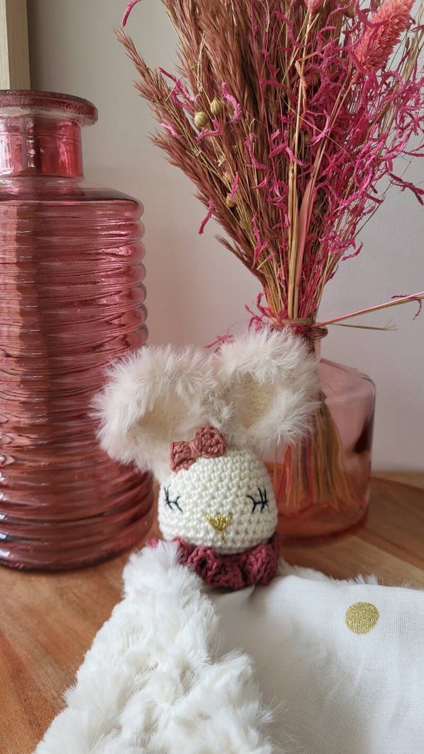 Mia, est un doudou Lapin entièrement fait à la main au crochet. Composé d'un tissu en gaze de coton à pois doré et d'un tissu blanc tout doux. Avec son petit noeud papillon rose vos petites filles vont l'adopter à coup sûr. De petite taille, il sera idéal pour les mains de bébé.